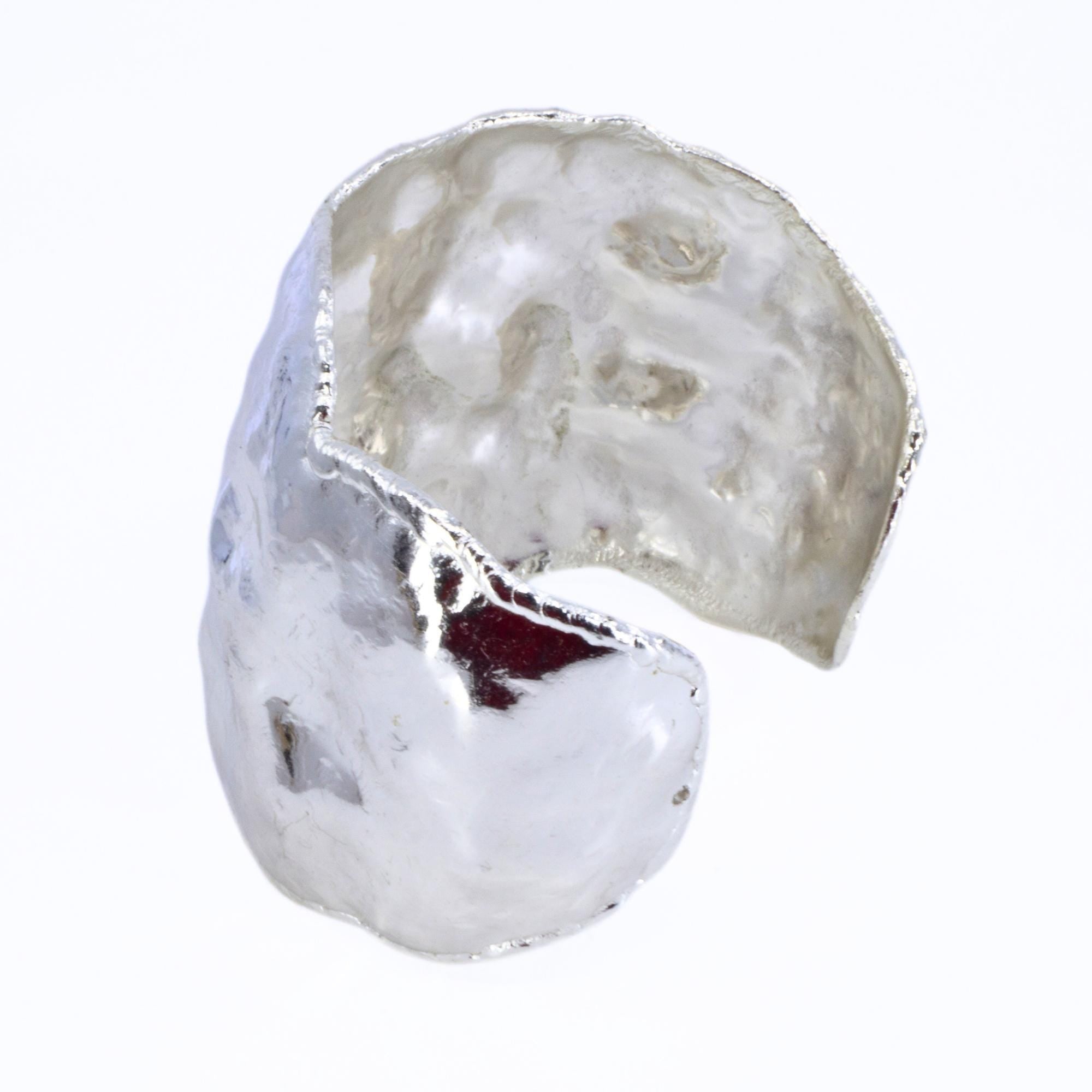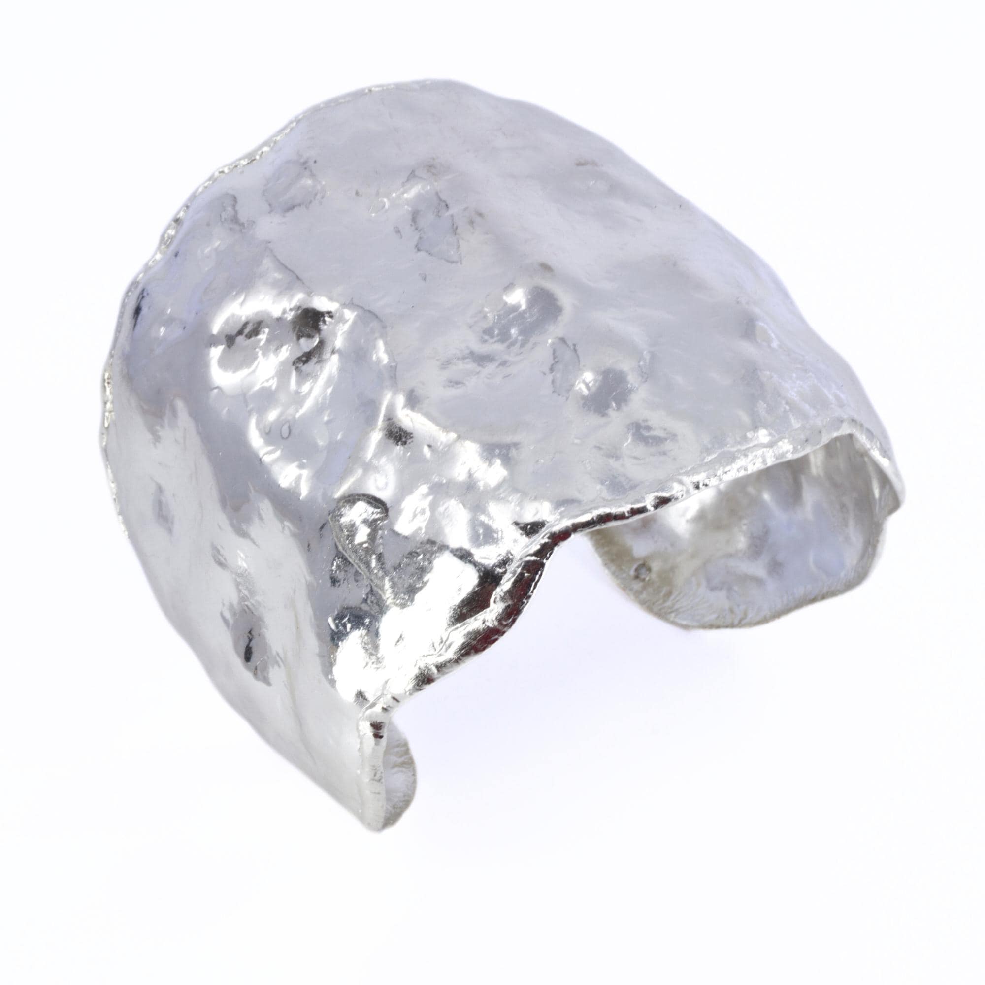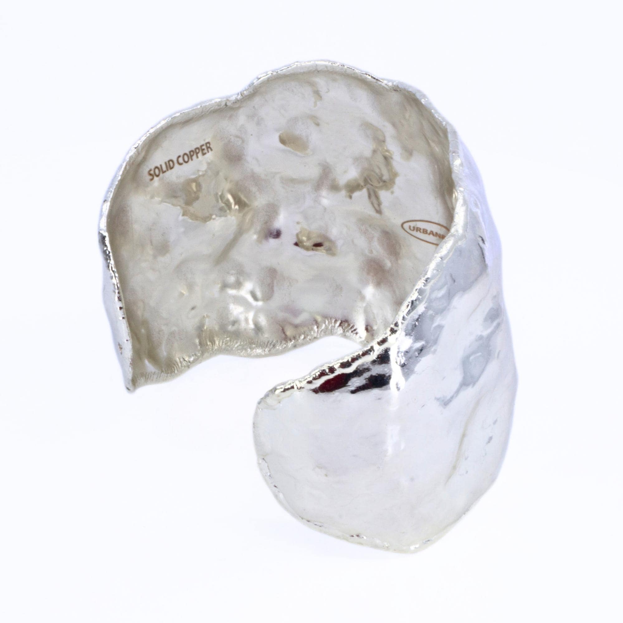 NOTE: Base metal is solid copper. Beautiful crumpled extra wide silver cuff with molten edging. These are very sturdy but adjustable. A little on the large side and probably not suitable for smaller wrist sizes. Sealed with high tech E-Coating, which will protect the cuff from oxidation, providing long-lasting wear & durability.